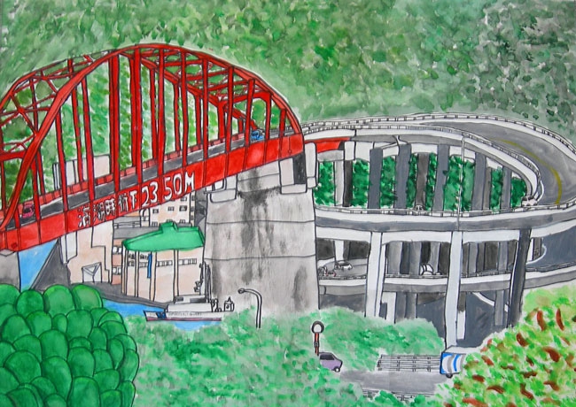 ぼくはこの絵をかく前は何にするかなやんでいました。でも、この音戸大橋を見てぼくは、これをかくと決めました。最初、音戸大橋をどういうバランスでかくかまよいました。