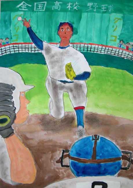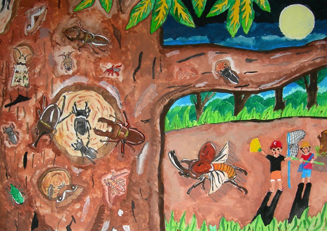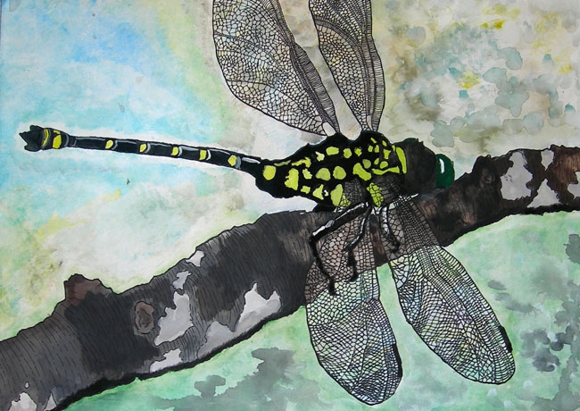 かこうと思った理由は生物をかこうと決めていて河原で遊んでいる時に、このオニヤンマを見つけて大きくきれいだったので決めました。かいている時はずっと「本物みたいにリアルに」と思いながらかきました。苦労した所は「はね」です。よく見ると線がたくさんあり、写真をとって虫メガネで見ながらかきました。同じようにかくのが大変でした。枝も丸く立体的にみせるためにぬり方を直線ではなく曲線でぬるように工夫しました。眼も光っているかんじをかきたくて色のぬり方や色づかいを工夫しました。本当の色に近づけるよう何回も色を作り直したりして思った色が、出せた時はうれしかったです。完成してみて本物のようにかけたと思うのでよかったと思います。