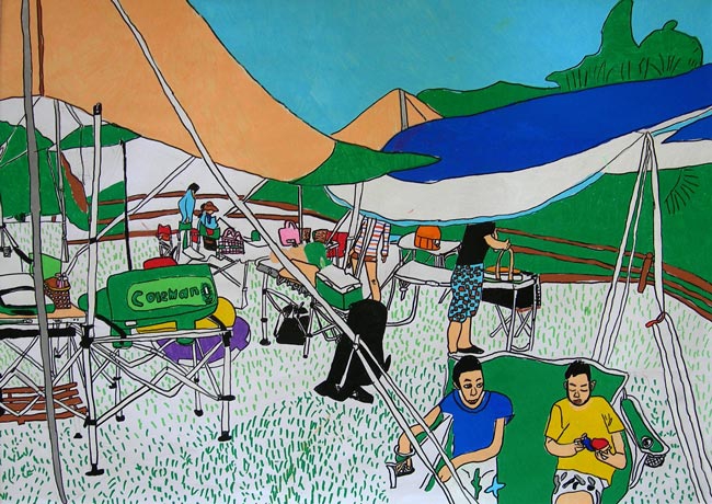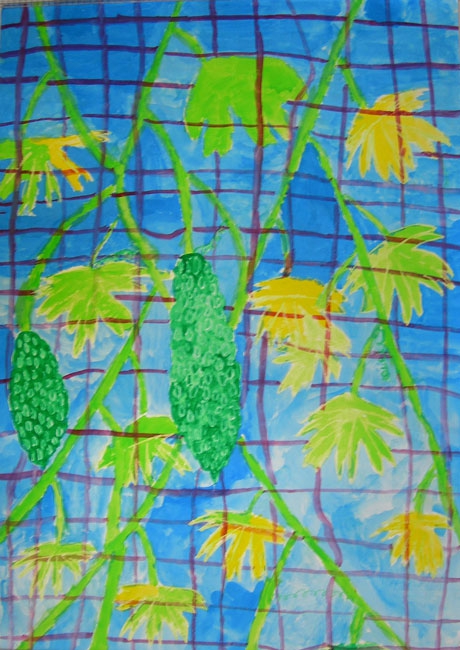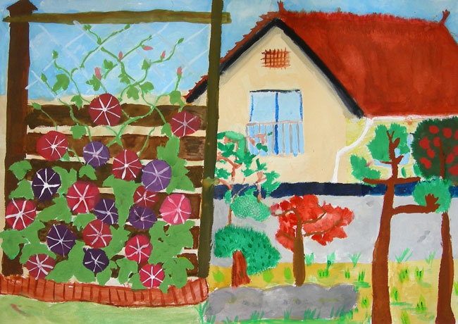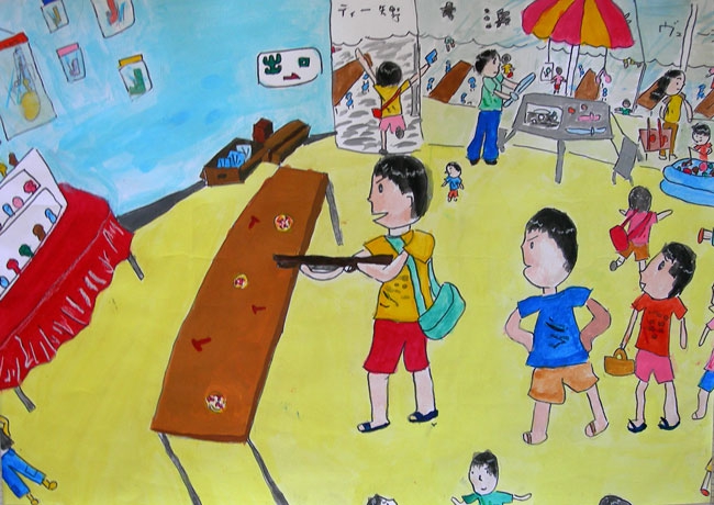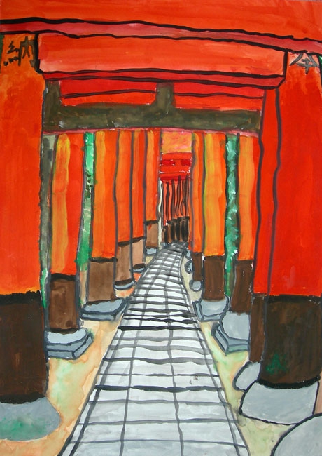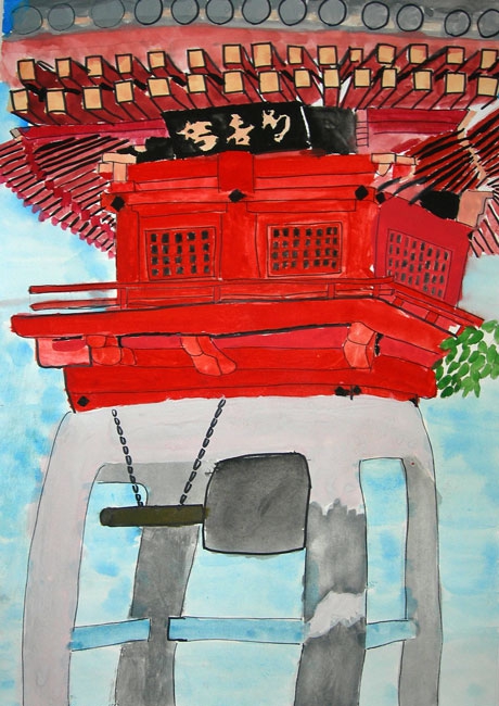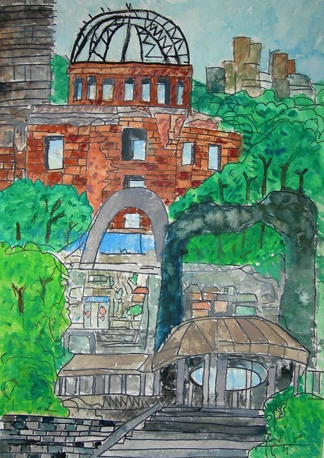 今年、日本におこった東日本大震災のニュースをみて、本人はいろいろなことを思ったようです。この夏に東北の小学生と接し、その時、平和って何かと考えていました。平和を考える中、何を描いたらいいのか、何を組み合わせたらそのことを表現できるの、考えていたようです。最終的には自分の住んでいる町にも過去、現在、未来があるということを思い出し、そのことを描いていました。