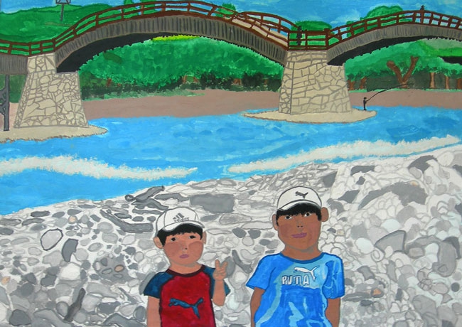 むずかしそうだったので、かいてみたいなと思ってかきました。かいている時はいつも楽しく、明るい気持ちでかいています。ぼくは、川の流れている様子や、人をはっきりかくことを工夫してかきました。また、人の後ろの石をかく所がとても苦労しました。完成した時は、とてもうれしかったです。