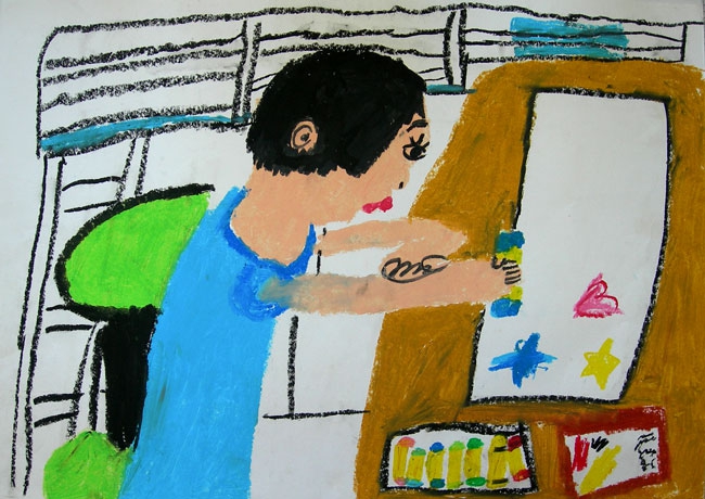 鉛筆で下書きをしている時にとても上手に出来ていたので、色をつける時に丁寧に塗ることと自分らしさが出るようにとアドバイスをしました。