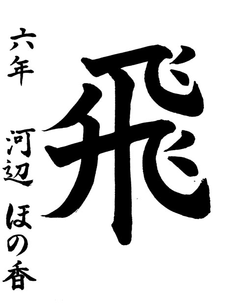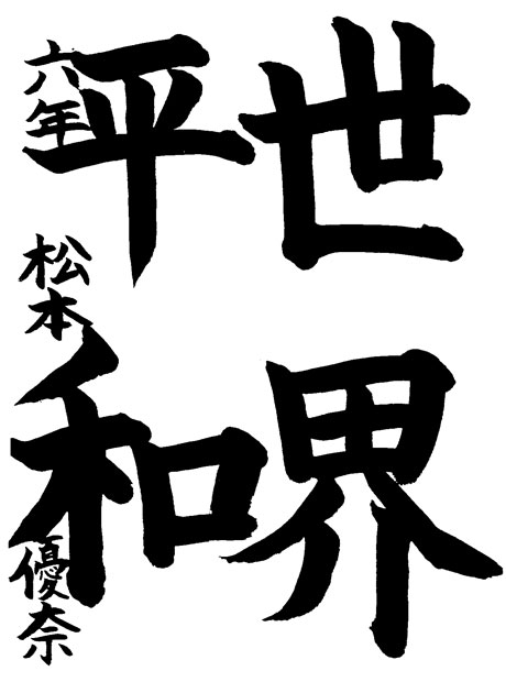 1番書くのに苦労したところは「世」の5画目と「界」の7画目のはらいです。うまく書けるまでたくさん練習しました。去年は銀賞をとって今年も安芸区長賞がとれたのでうれしかったです。今年は良い賞がとれたので来年もがんばりたいです。