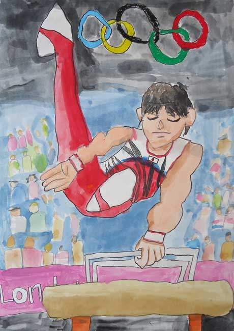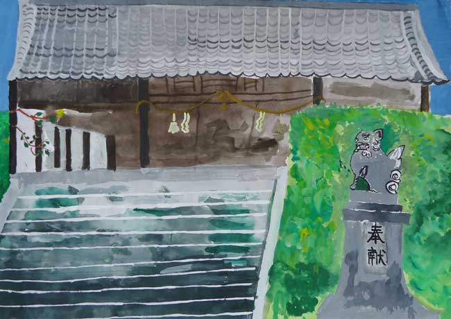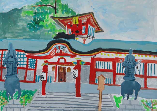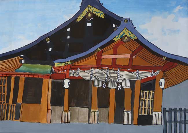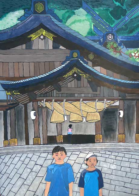 どんな建物がおもしろいのか、どのように決めればいいのかなやんでいました。出雲大社の見学に行った時、石だたみや柱の色、太さ、屋根のかわらなどすごいと思いかいてみようと思いました。バランスがくずれやすく遠近法の出しにくい絵は初めてでした。それでもがんばってかいたので、今までで最高の絵が完成しました。うれしかったです。
