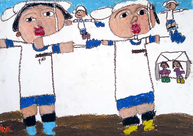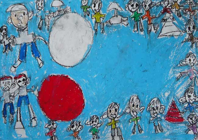 「今も戦争が起こっている国がある。」という話題をテレビで見ました。日本人がぎ牲になることもあります。ぼくは、1945年広島に原子爆弾が投下されたということもあり世界平和を願う気持ちで、この作品を書きました。