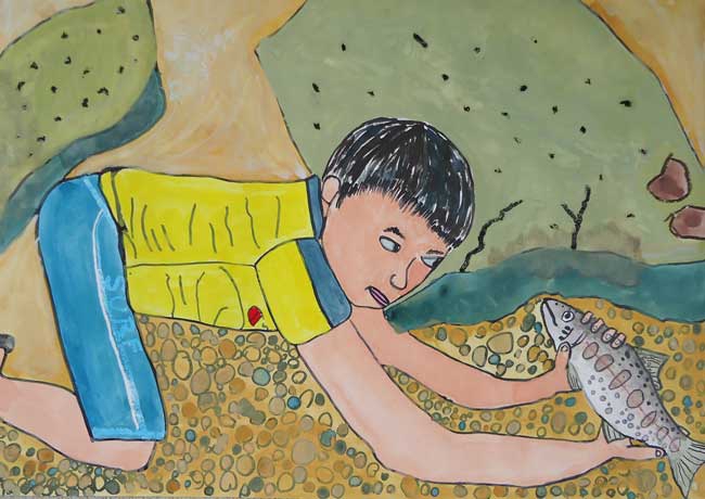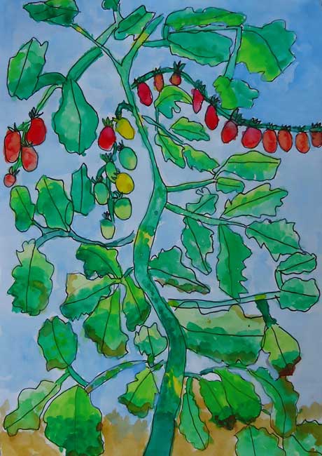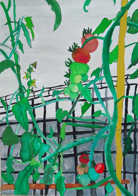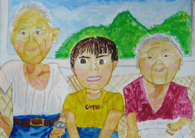 ぼくは「じいちゃん家」の雰囲気や庭などが大好きなので描こうと思いました。庭で花火をしたり畑のスイカを収穫したり、家の中ではいとこと探検的な遊びをしたりした事を思い出しながら描きました。工夫した所は、かわらに太陽が当っている所とそうでない所の色の変化です。窓のすけている感じや人と車をバランスよく描く事が難しかったです。完成してみて、自分なりにはいつもの「じいちゃん家」が再現出来たと思います。