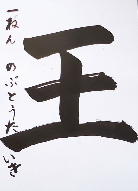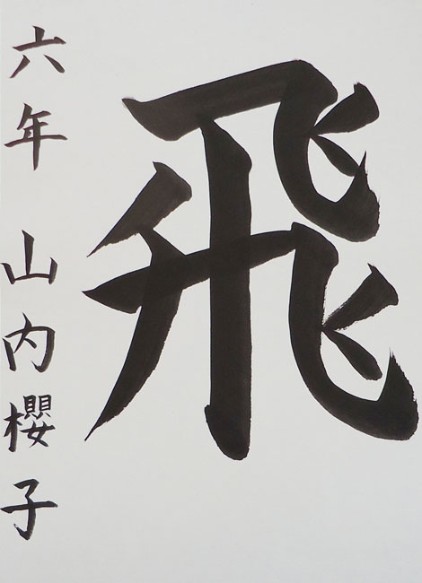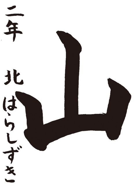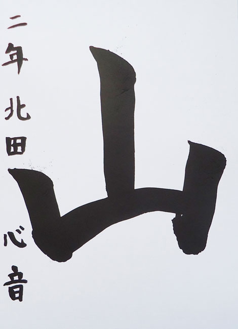 今年は漢字を書こうと思ったので、画数が少なくてかっこいい「山」にしました。止める所、出す所を意識して、楽しい気持ちで書きました。完成したらうれしかったです。