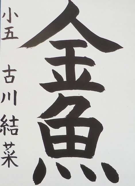 この作品を書こうと思ったのは「金魚」と言う字が、むずかしそうで、ちょうせんしてみたかったからです。書く時は、気持ちを集中させて一文字一文字一生けん命書きました。バランスをとる事がむすかしかったです。でも、何まいも何まいも書いていると、だんだんコツがつかめて書くのが楽しくなって来ました。工夫した所は、筆の強弱です。一つの字の中にも力強く書く所と細めに書くと所を使い分けるのを。工夫しました。完成した作品は自分でもなっとくした一まいでした。これからも一生けん命がんばります。
