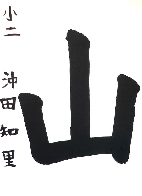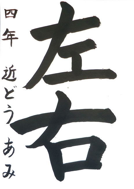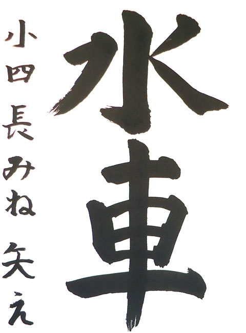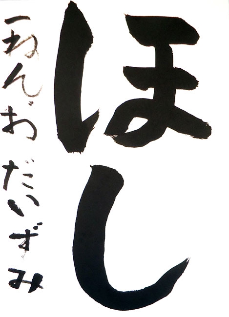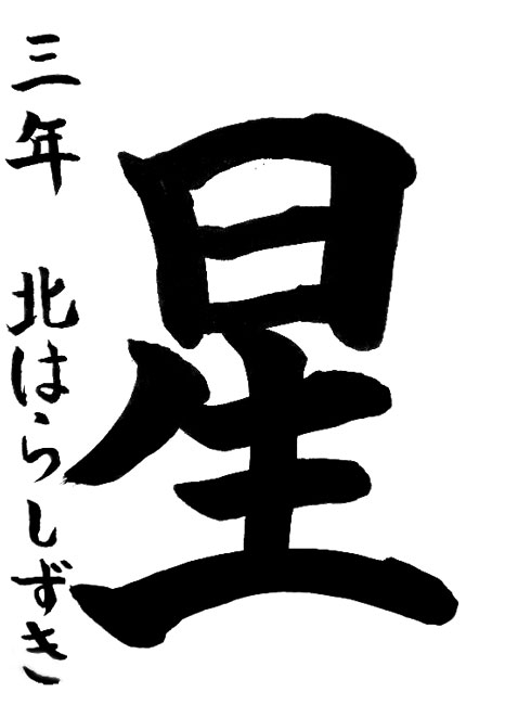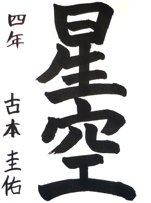 「太くのびのびとした線で書けるといいね。」と声かけをすると墨をたっぷりふくませて一画ずつしっかりと書いていました。筆を持つことが好きで何枚も練習していました。輝く星をイメージしていたのか楽しそうに書いていました。この度、賞を頂いて大変喜んでいます。