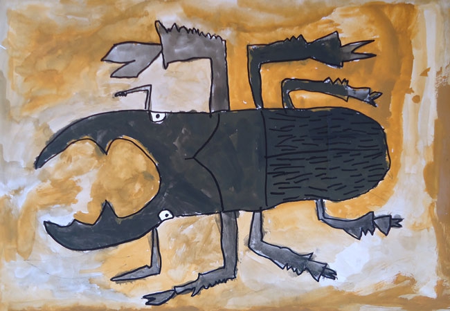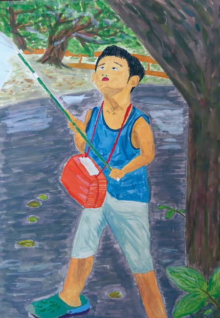 夏休みの朝、弟はいつも近くの神社にせみをとりに行っていました。その時のいつもとはちがう真けんな表じょうをかきました。虫とりあみをかまえて、せみをじっと見ている様子がうまく表現げんできたと思います。