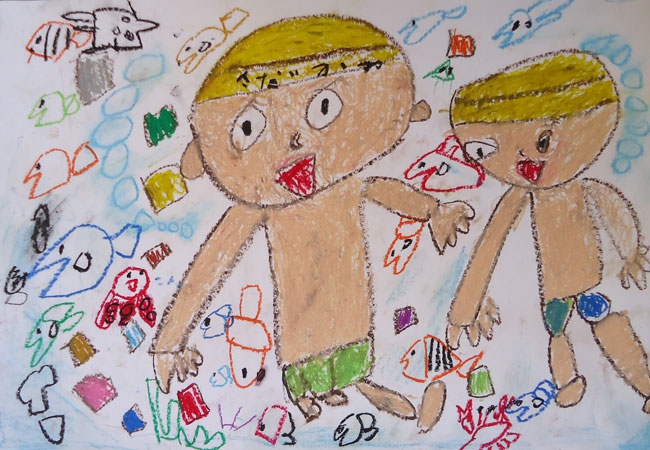海での遊びが大好きです。学校で学習したクロールの泳ぎ方をデジカメにとり下書きをしました。手を一番に、顔の表情、そして足と 描くうちに画用紙いっぱいになりました。絵の具の色の作り方は、まだ難しいようです。小筆を画用紙にトントンと置いていくことに感心を示し、よくがんばって完成させました。