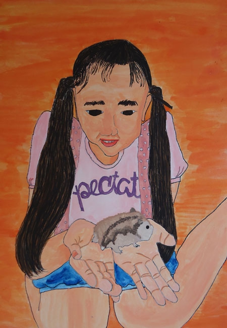 絵の具をまぜて、みかの毛の色を作って時間をかけて描きました。