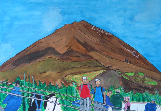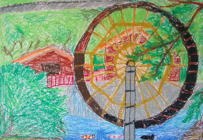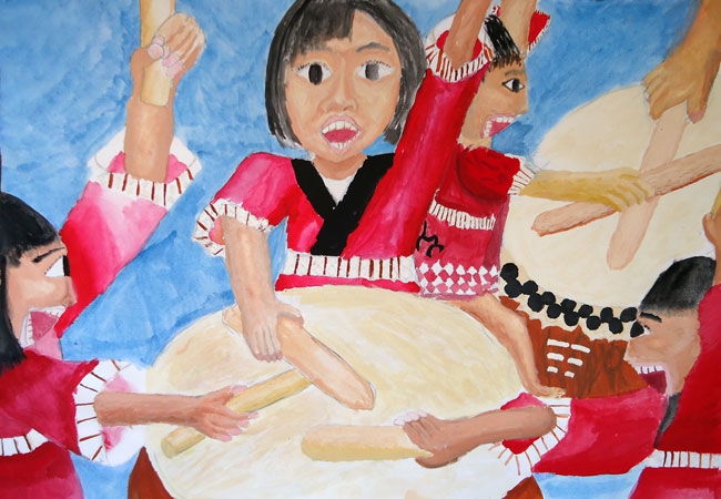 最後に光やかげをつけて、ていねいに仕上げました。赤、青、黄、黒、白の5色だけを使って、自分で色を作る作業が楽しかったです。