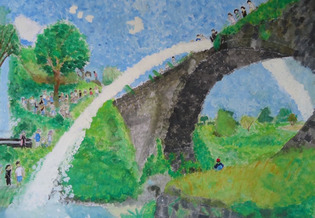 私がこの作品を書こうと思ったのは、城を書いてみたかったし、夏休みに熊本城に旅行に行ったとき、家族にすすめられたからです。工夫や苦労をしたことは、かげをつけたり、葉っぱを筆でトントンとして葉っぱらしくみせるところです。