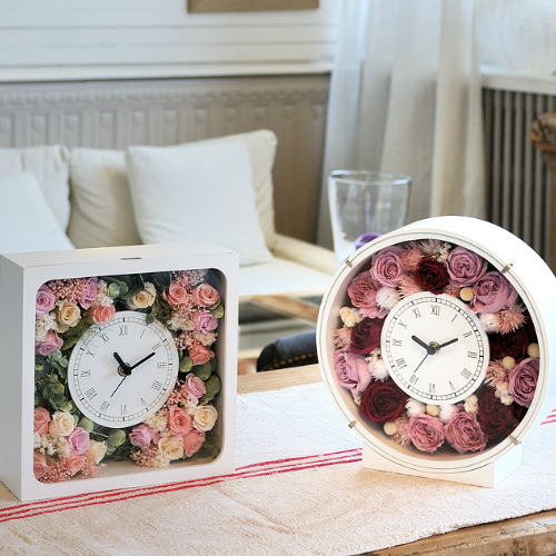 プリザーブドフラワーの花時計はプリザーブドフラワー&記念のメッセージを一緒に飾れる優れもの。日頃の感謝の気持ちを込めて、両親に、おじいちゃんやおばあちゃんへ。結婚する友人へ。転勤や退職で離れる同僚へ。お世話になった先輩や先生へ。